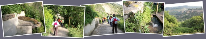 Seguimos descendiendo por el sendero vallado por un bosque de árboles secos hasta llegar a una pequeña carretera que cogemos en dirección a la derecha. Si hay algo que llama poderosamente la atención es el canto de los pájaros y el tintineo del agua que nos acompaña en todo momento.